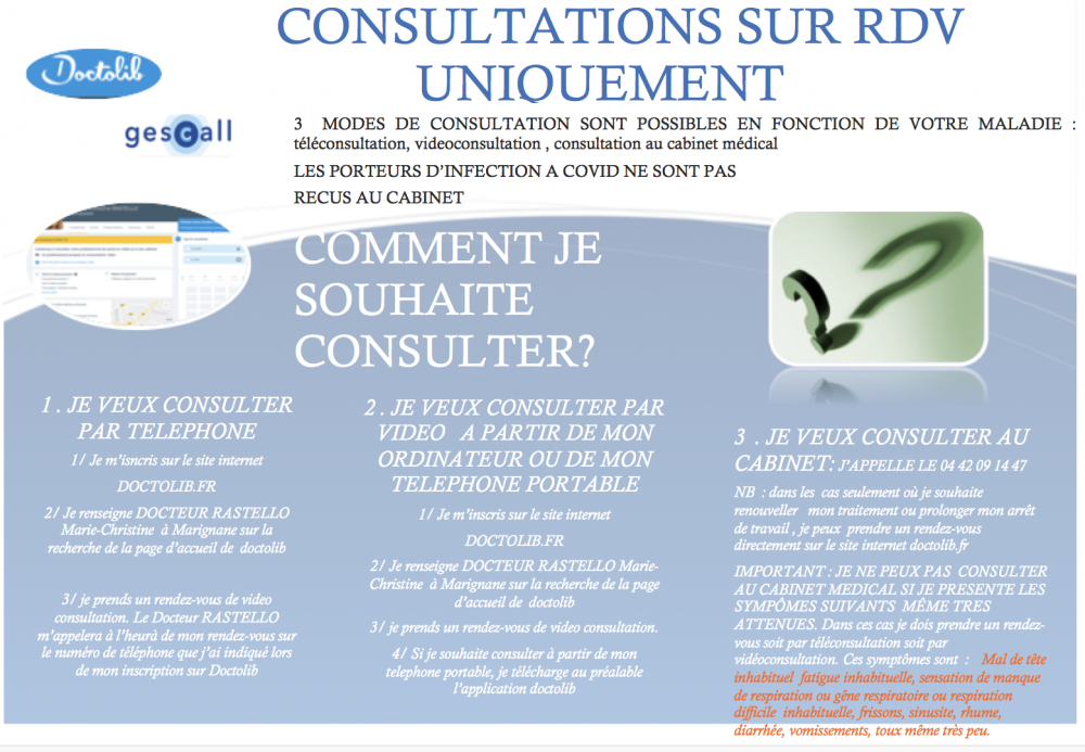 NB : dans les cas où vous souhaitez renouveller votre traitement ou prolonger votre arrêt de travail , il est recommandé de prendre un RDV directement sur le site internet doctolib.fr